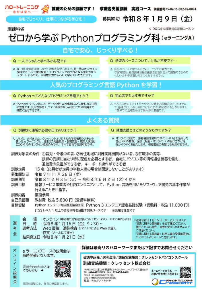 | 訓練科名 | ゼロから学ぶPythonプログラミング科(eラーニングA) |