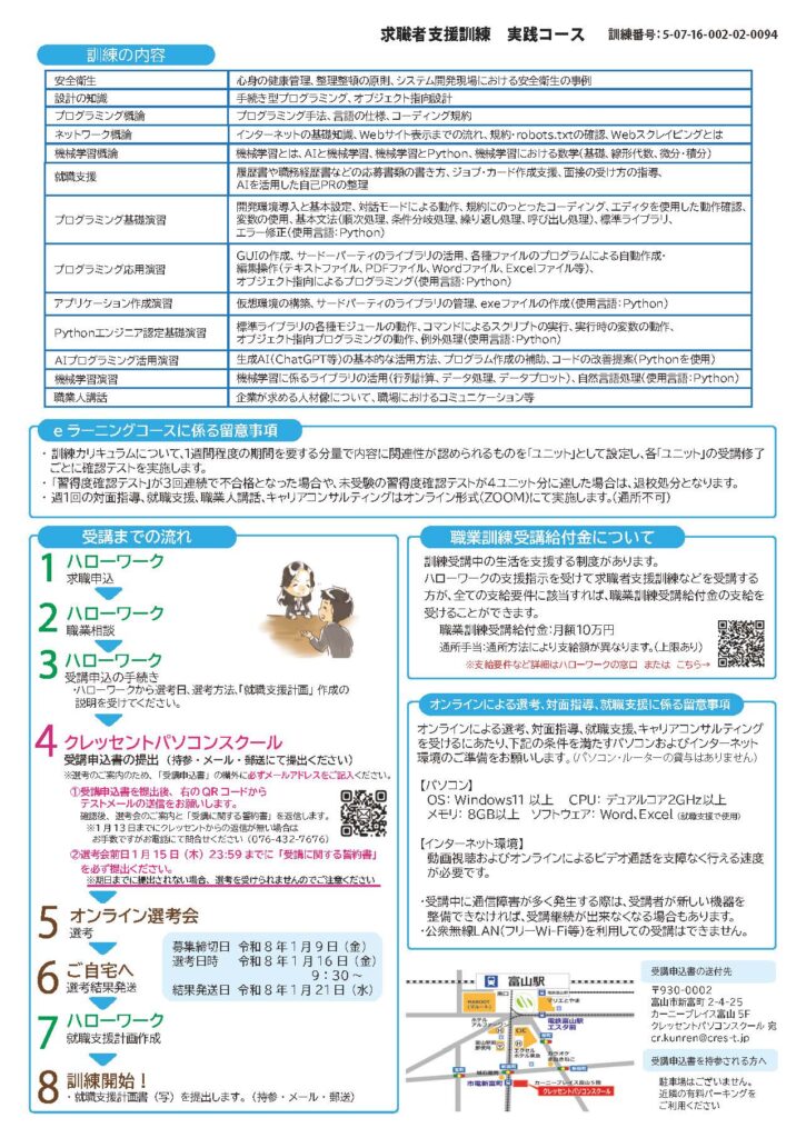 | 訓練実施施設 | クレッセントパソコンスクール 富山市新富町2-4-25 カーニープレイス富山5階 |