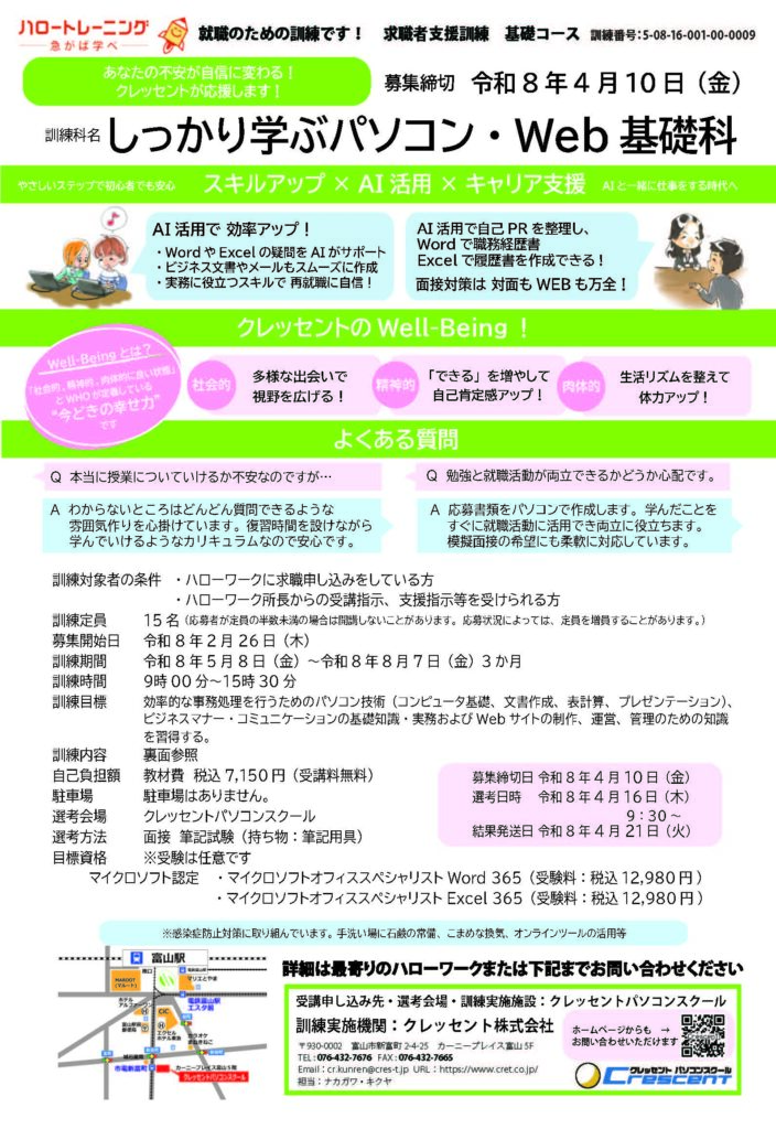 | 訓練科名 | しっかり学ぶパソコン・Web基礎科【5-08-16-001-00-0009】 |