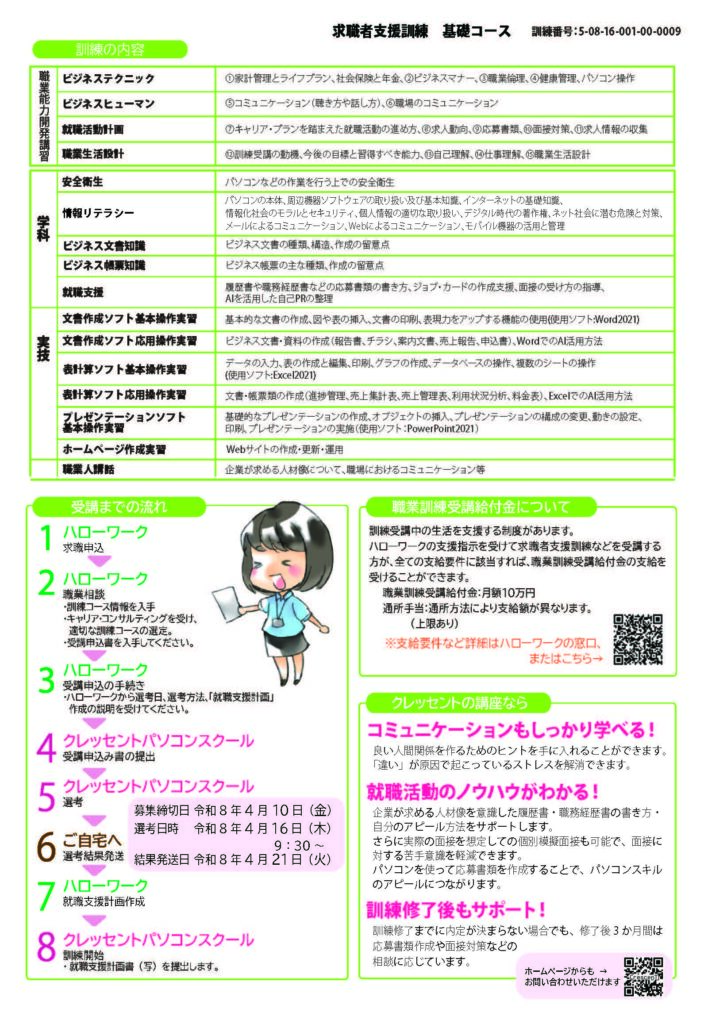 | 選考日 | 令和 8 年 4 月 16 日(木) 9 時 30 分 ~ 選考方法:面接 筆記試験 持ち物:筆記用具 選考会場:クレッセントパソコンスクール |